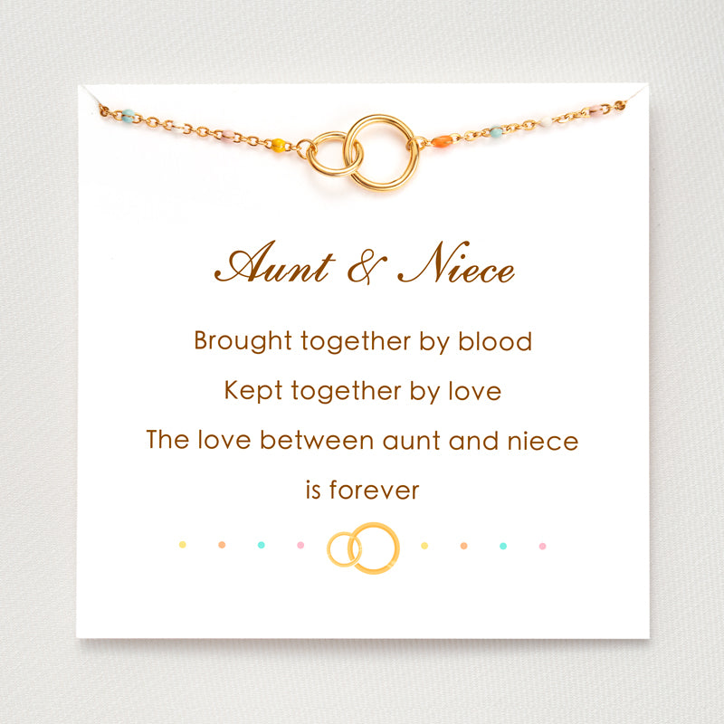 This elegant bracelet features an interlocking circles design decorated with subtle but colorful rainbow stones. It was created to inspire and empower. Attached with a beautifully written message card, it is a perfect inspirational gift for both aunt and niece on birthdays, holidays, and many more occasions.